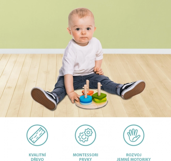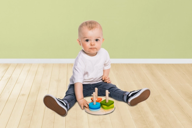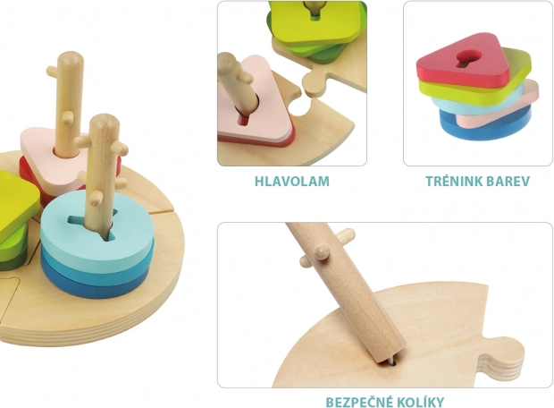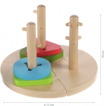 Een kleurrijke puzzel op een ronde basis, bestaande uit 3 delen. Elk deel bevat een houten staaf met uitstulpingen waarop houten, kleurrijke vormen kunnen worden geplaatst. Het speelgoed ontwikkelt coördinatie, ruimtelijk inzicht en handvaardigheid. Dankzij de vele combinatiemogelijkheden prikkelt het ook de kinderhersenen en stimuleert het creatief denken. De puzzel is gemaakt van hoogwaardig hout en verf op waterbasis.