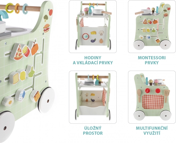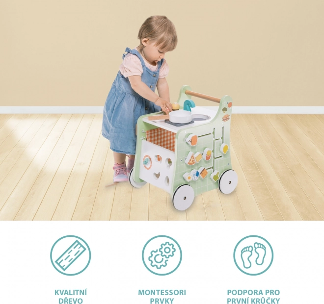 De schattige loopwagen in de vorm van een keukentje begeleidt het kind veilig bij de eerste stapjes. Een houten handgreep dient om het evenwicht te bewaren en om zich aan vast te houden. Vier stille wielen helpen bij het aanleren van stabiliteit en de eerste stappen.