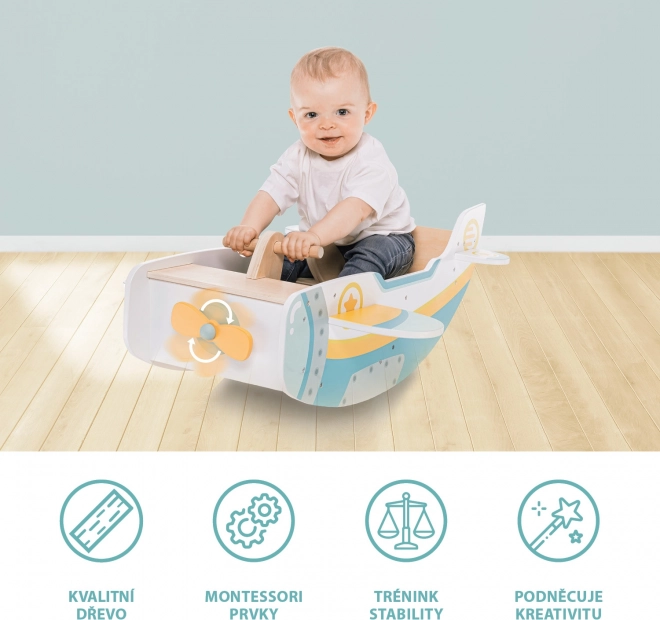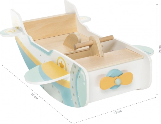 Een vliegtuig dat klaar is voor vertrek en kinderen urenlang plezier bezorgt. Veilig schommelen wordt gegarandeerd door twee stuurstangen aan de voorzijde. De brede zitting heeft een rugleuning, voor wanneer het kind zachtjes wil schommelen met zijn eigen gewicht. De vliegtuigschoommel is gemaakt van hoogwaardig, duurzaam beukenhout. Alle gebruikte kleuren zijn niet schadelijk voor de gezondheid en op waterbasis.