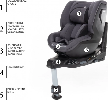 Het autostoeltje heeft de zwaarste tests in Nederland doorstaan, voldoet aan de norm ECE R129 i-Size en is geschikt voor kinderen vanaf de geboorte tot 105 cm lengte of 18 kg. Het is volledig draaibaar (360°), waardoor niet alleen de rijrichting in alle 4 verstelbare posities kan worden gewijzigd, maar ook het in- en uitstappen van het kind veel gemakkelijker wordt.