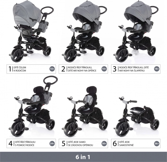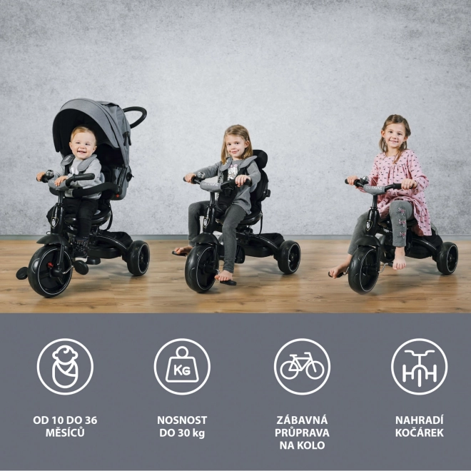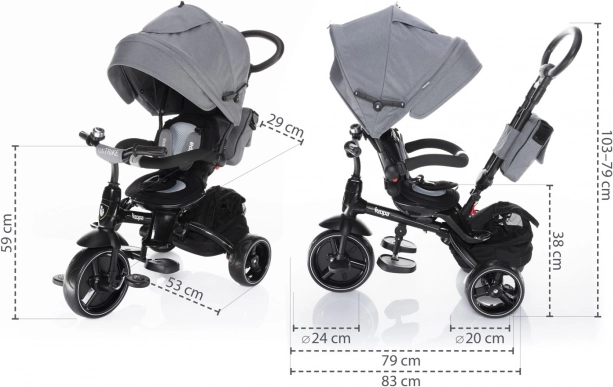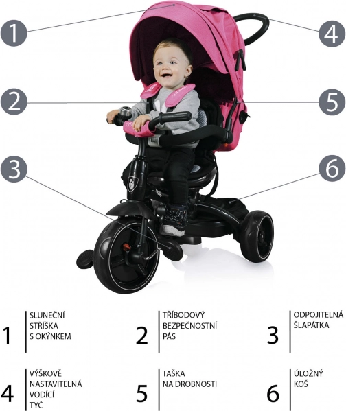 De mogelijkheid om de zitting tegen de rijrichting in te draaien, de pedalen los te koppelen en de zonnekap, beugel en rugleuningen stapsgewijs te verwijderen maakt het eenvoudig de driewieler aan te passen aan de leeftijd en vaardigheden van het kind.