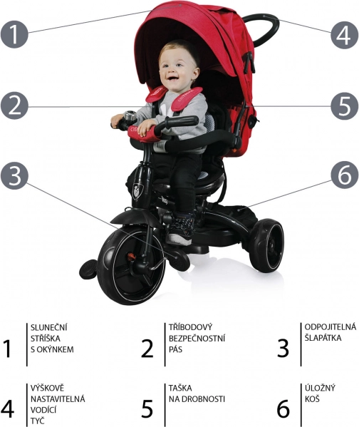 De veiligheid wordt gewaarborgd door kwalitatieve gordels en een praktische knop om het meedraaien van de pedalen te blokkeren. Je zult ook de mogelijkheid waarderen om de zitting tegen de rijrichting in te draaien voor beter toezicht op je kind. De ruime achtermand en het tasje bieden plaats aan alles wat je nodig hebt voor een wandeling.