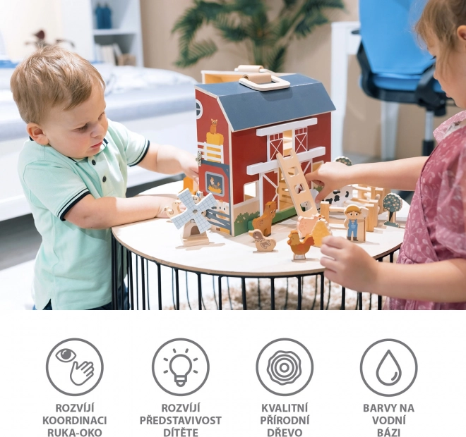 Het speelgoed is ontworpen om intensief spel te weerstaan en is geschikt voor kinderen vanaf drie jaar. Bevat een houten schuur met realistische dierenfiguren. Met dit speelgoed kunnen kinderen hun verbeelding, coördinatie en sociale interactie ontwikkelen.