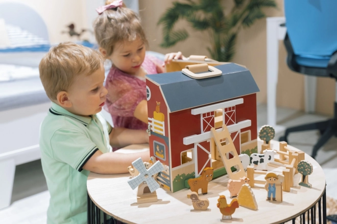 Prachtige houten boerderij met handvat voor eenvoudig meenemen en spelen waar je maar wilt.
