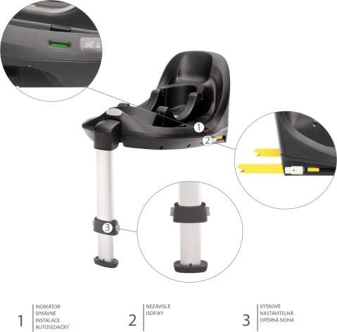 Onafhankelijke ISOFIX met indicatoren voor een eenvoudige en veilige installatie van het autostoeltje in het voertuig. Het autostoeltje beschikt over een steunpoot die een extra contactpunt toevoegt voor meer stabiliteit; ook de steunpoot heeft een indicator voor de juiste instelling. Extra stabiliteit wordt bovendien geboden door de veiligheidsbeugel. Indicatoren bevestigen de correcte plaatsing van het autostoeltje op de basis. Het autostoeltje kan eenvoudig van de basis worden verwijderd via de vergrendeling.