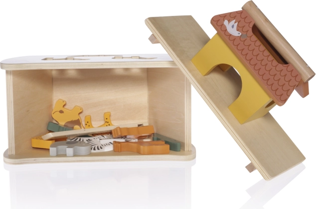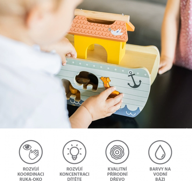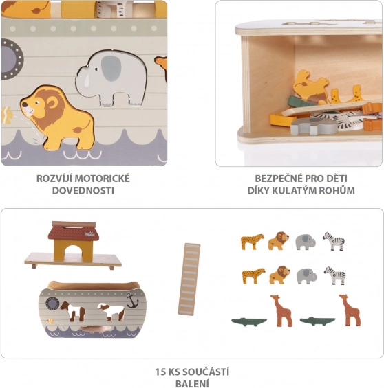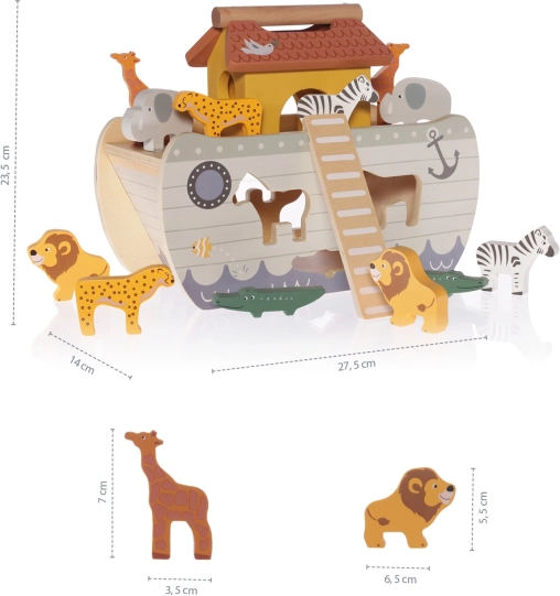 Geef uw kleine avonturier de kans om het dierenrijk te redden, zoals in het bijbelse verhaal over Noach en de ark. De houten inlegpuzzel ontwikkelt de oog-handcoördinatie, logisch denken, verbeeldingskracht en leert dieren herkennen.