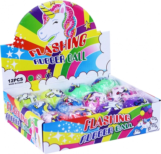Stuiterbal met eenhoornmotief en knipperend licht, diameter 5,5 cm. 6 kleuren, verpakking 12 stuks. Plezier voor kinderen en volwassenen, ideaal om te spelen en te ontspannen.