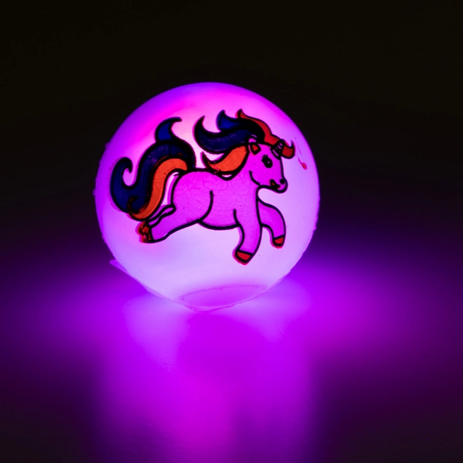 Leuke stuiterbal met eenhoornmotief en geïntegreerd licht dat bij landing in kleur knippert. Geweldig voor kinderen en volwassenen, ideaal om te spelen, te ontspannen en stress te verminderen. Verkrijgbaar in 6 vrolijke kleuren, verpakt per 12 stuks.