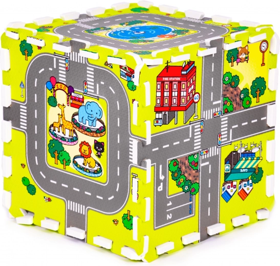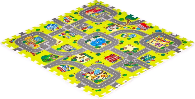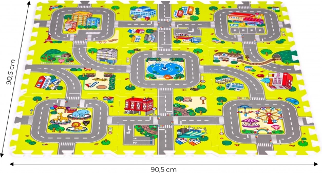 Deze schuimen speelmat met een kleurrijk stads-, wegen- en gebouwenmotief creëert een inspirerende ruimte voor fantasie, leren en motorische ontwikkeling. Ze biedt kinderen een comfortabel en zacht plekje om te spelen, te kruipen en de eerste stapjes te zetten, terwijl ze beschermt tegen kou van de vloer en schokken bij vallen dempt.