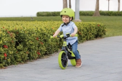 Brede, gripvaste 10" TPE-banden en een gebogen stuur met comfortabele handvatten zorgen voor veilig sturen op diverse ondergronden. De dubbele zithoogte-instelling groeit met het kind mee en biedt een ideale zitpositie vanaf de eerste stappen tot zeker rijden.