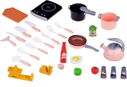 De set bevat alles wat een kleine chef nodig heeft: kookplaat, servies, keukengerei en zelfs etenswaren en smaakmakers.