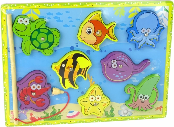 De houten set voor het vangen van zeedieren is uitgerust met een prachtig geïllustreerd bord dat de zeebodem voorstelt en kinderen een fascinerende kijk in de onderwaterwereld biedt. De diverse houten dierfiguren kunnen speels worden geplaatst en dankzij ingebouwde magneten met een houten hengel worden gevangen.