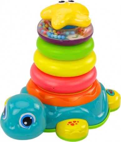 Piramide Rijdende Schildpad 2-in-1 is een dynamisch stuk speelgoed dat plezier combineert met leren. De basis in de vorm van een rijdende schildpad reageert op obstakels en biedt licht- en geluidseffecten, waardoor het spel interactiever wordt.