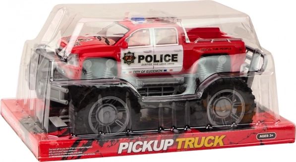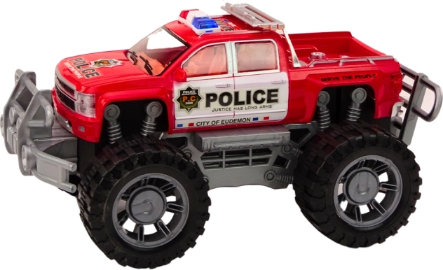 Stijlvolle politieterreinpickup in het rood die kleine liefhebbers van actie zal verrassen. Dankzij het opwindsysteem (inertie) rijdt hij na het terugtrekken vanzelf weg, heeft grote zwarte terreinbanden en realistische details, waaronder de opdruk “POLICE” en lampen op het dak. Het model is groot en indrukwekkend – ideaal voor creatief spelen thuis en in de tuin. Grote terreinbanden, opwindsysteem – rijdt na het terugtrekken, realistische politie-elementen, robuste uitvoering.