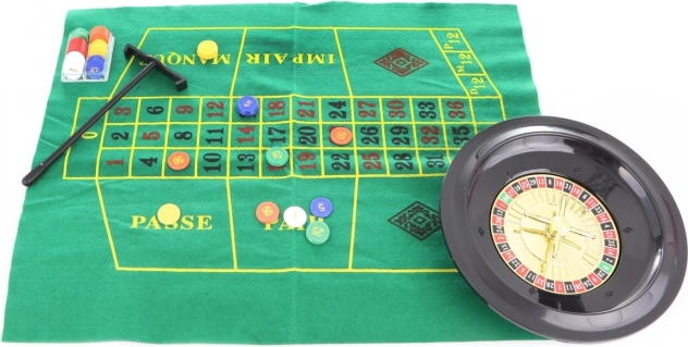 Gezelschapsspel Roulette. De set bevat een roulette met een diameter van ca. 25,5 cm, een speelkleed, een harkje, 2 metalen balletjes, 60 gekleurde fiches en spelregels. Afmetingen verpakking ca. 42,5 x 33 x 6 cm. Leeftijd 3+