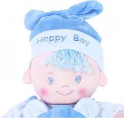 Schattige lappenpop in een blauwe outfit met mutsje, ideaal om te knuffelen en voor het eerste spel. Zachte textielstof, geborduurd gezichtje en het compacte formaat van 25 cm maken haar tot het perfecte speelmaatje voor kinderen thuis en onderweg.