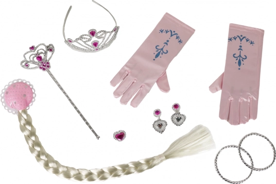 - In de set: kroontje, oorbellen, ringen, toverstaf, armbanden, handschoenen en een lange blonde vlecht
