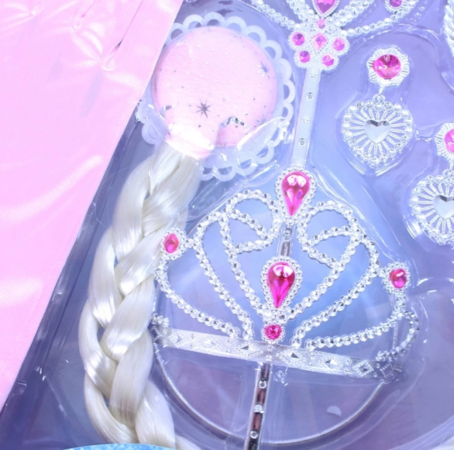 Roze prinsessenset met kroontje, toverstaf, handschoenen, armbanden, oorbellen, ringen en een lange blonde vlecht. Ideaal als kostuum voor meisjes vanaf 3 jaar.