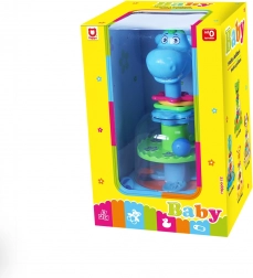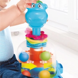 Deze kleurrijke mechanische draaimolen in de vorm van een dinosaurus verandert elk speelmoment in een vrolijke ervaring. Druk gewoon op de kop en kijk hoe de balletjes gaan draaien, stuiteren en rammelen – ideaal ter ondersteuning van de oog–handcoördinatie en het begrip van oorzaak en gevolg.