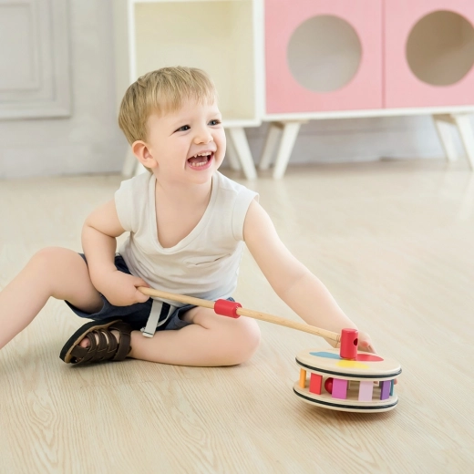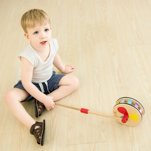 Het speelgoed is van duurzaam gelakt hout en gekleurd met niet-giftige, kinderveilige verven. Tijdens het rollen maakt het zachte geluiden die de zintuiglijke waarneming stimuleren. Ideaal voor de ontwikkeling van coördinatie, balans en fysieke fitheid van kinderen vanaf 12 maanden.