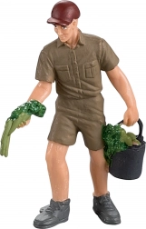 De gedetailleerde figuur van de boer houdt een emmer en groenten vast om de dieren te voeren en voor ze te zorgen.