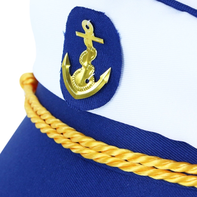 Stijlvolle kinderkapiteinspet in wit-blauw voor kleine zeelieden. Blauwe klep, contrasterende bies en een gouden decoratief hoefijzer aan de voorkant maken het een opvallend accessoire voor carnaval, feestjes en thematische foto’s.