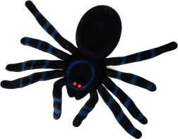 Een zwarte pluchen spin met blauwe strepen en opvallende rode ogen is de ideale decoratie voor je Halloweenfeest. Het realistische uiterlijk en het zachte materiaal zorgen ervoor dat hij ieders aandacht trekt.
