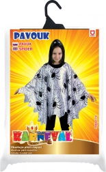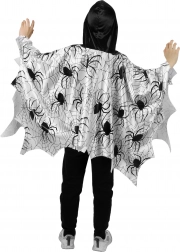 Op zoek naar een eenvoudig en opvallend kostuum voor kinderen? Deze lichte cape/poncho met zwarte print van spinnen en spinnenwebben op een witte basis valt meteen op. Dankzij de losse snit trek je hem gemakkelijk over het hoofd aan en biedt hij onbeperkte bewegingsvrijheid tijdens spel, dans en optochten.