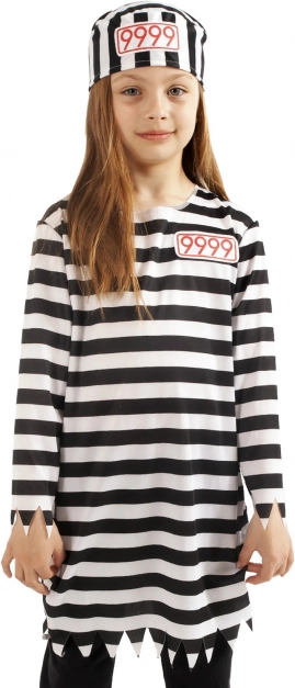 Stijlvolle gestreepte gevangenenoutfit voor meisjes van 6–8 jaar (117–128 cm), perfect voor carnaval, verkleedpartijen en schoolfeestjes. Bevat een lange gestreepte top en een muts met nummer 9999. De praktische ECO-verpakking bespaart ruimte en materiaal en is ideaal voor online aankopen.