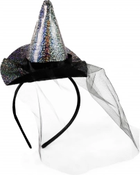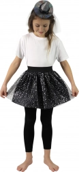 Geweldige set voor alle kleine dametjes-heksjes! Het rokje heeft een zwarte onderrok, bedekt met tule met een print van zilveren sterretjes. Geschikt voor meisjes van 3–7 jaar. De rok is 28 cm lang. De set wordt aangevuld met een haarband met een hoedje dat perfect bij het rokje past. Ook ideaal voor een Halloweenfeest of carnaval!