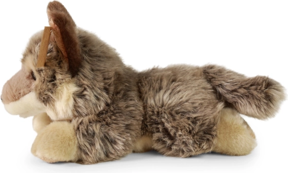 Deze zachte, liggende wolf oogt levensecht dankzij de fijne details en het hoogwaardige materiaal. De vulling van gerecyclede PET-flessen voelt net zo aan als de klassieke variant, is veilig en gecertificeerd, ook voor de allerkleinsten.