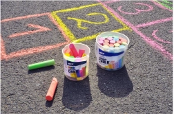 De set is perfect voor buitenactiviteiten op stoep of speelplaats en na het spelen spoel je het eenvoudig af met water. Kleursamenstelling: 2× geel, 2× groen, 4× oranje, 2× roze, 2× paars.