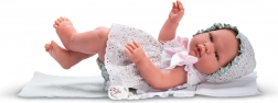 De pop is prachtig gekleed in witte kanten jurkjes met mutsje en wordt geleverd met een kussentje, dekentje en een fopspeen aan een ketting die in het mondje kan worden geplaatst. Geschikt voor rollenspel; stimuleert empathie, fijne motoriek en fantasie.