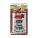De set bevat een metalen locomotief en drie plastic wagonnetjes, ideaal voor kleine verzamelaars.
