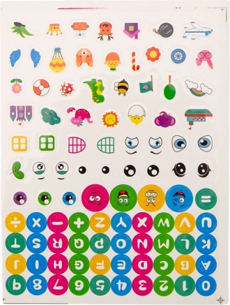 Stickers met letters, cijfers en motieven helpen kinderen logica, woordenschat en basisrekenen te ontwikkelen.