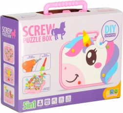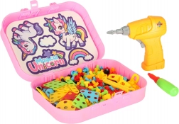 De set is opgeborgen in een duurzaam plastic koffertje met geperforeerde plaat om in te schroeven. Dankzij de rijke uitrusting en stickers met eenhoornthema is het leuk voor zowel individueel spel als voor groepen kinderen.