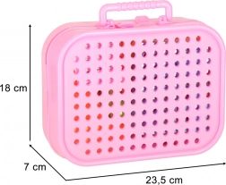 Licht roze koffertje met ventilatieopeningen en handvat houdt alle onderdelen bij elkaar en dient als werkbasis om te schroeven.