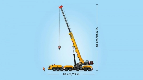 Indrukwekkende LEGO City gele mobiele kraan voor kinderen vanaf 9 jaar biedt realistische functies zoals uitschuifbare steunpoten, een draaibare cabine, een 360° draaende en uitschuifbare giek en een functionele hijs. Inclusief 4 minifiguren van bouwarbeiders, een mobiele toiletunit en accessoires voor authentiek speelplezier.