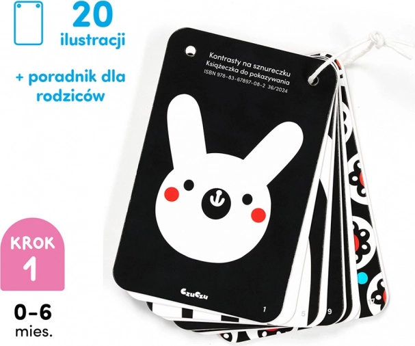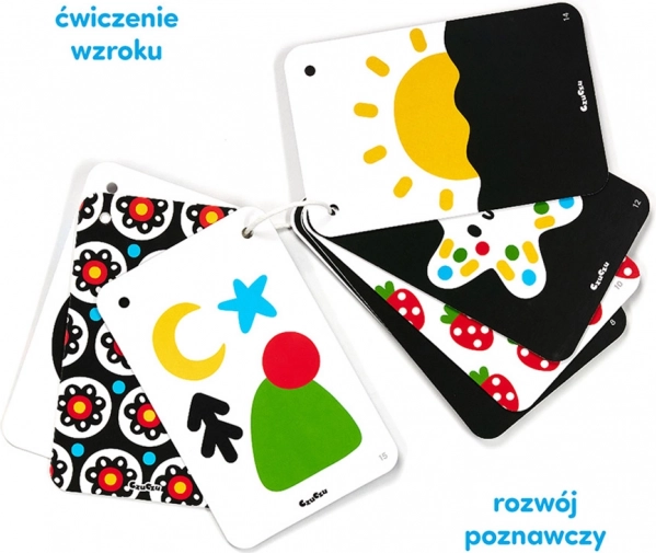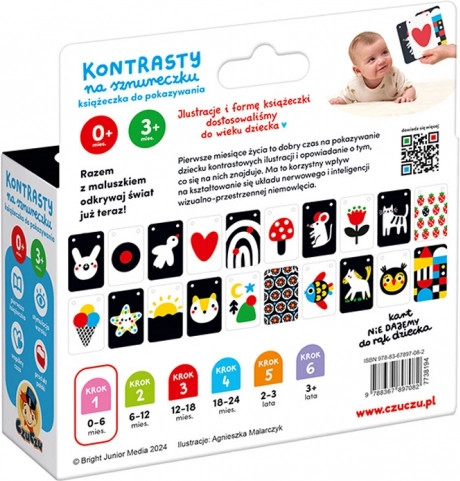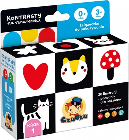 Het praktische boekje aan een koord bevat 20 illustraties. De duidelijke contrastpatronen trekken de ogen en de aandacht van je baby. Bekijk ze samen en praat over wat jullie zien. Het is een geweldige manier om qualitytime met je kleintje door te brengen en een bijzondere band op te bouwen. We hebben een gids toegevoegd vol informatie over de ontwikkeling van het gezichtsvermogen van baby’s en spelideeën.
