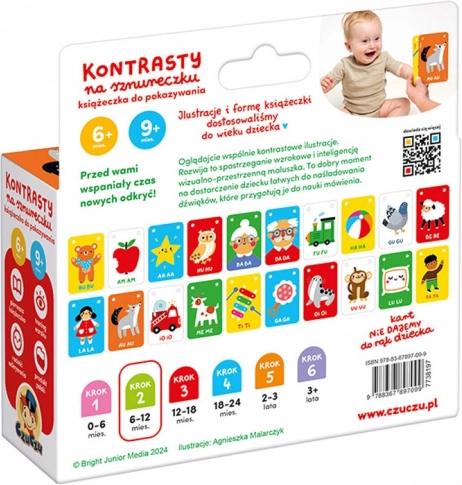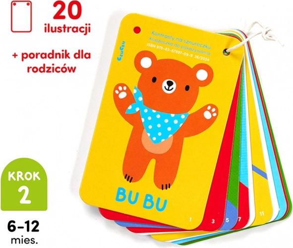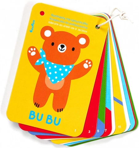 Contrastboekje CzuCzu aan koord voor baby’s 6m+. Stimuleert zicht, aandacht en vroege spraak. 20 pagina’s, 2 gaatjes om op te hangen, compact formaat.