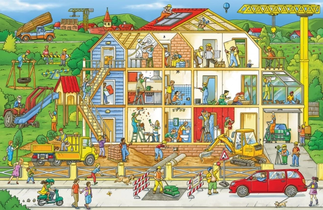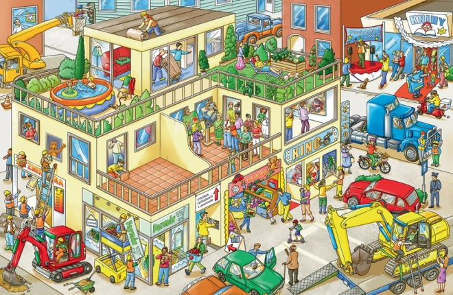 Het boek bevat illustratieve scènes die een levendige bouwplaatsomgeving weergeven met verschillende bouwmachines.