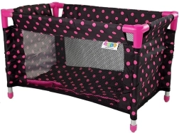 Stijlvol poppenbedje Alice in een zwart‑roze design met stippen maakt elke kleine mama blij. Het heeft transparante gaaszijwanden voor eenvoudig toezicht op de pop, een stevige aluminium constructie met roze kunststof verbindingsstukken en wordt geleverd met een kussentje, dekbedje en een praktische draagtas. Geschikt voor poppen tot 40 cm.