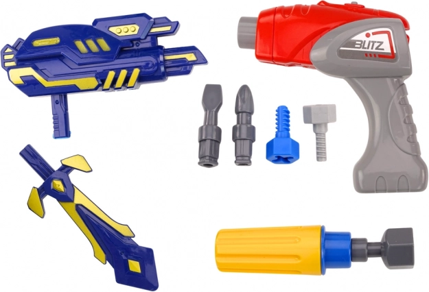 De set bevat een kinderboormachine en schroevendraaier die geschikt zijn voor kleine handen, plus drie verwisselbare opzetstukken. Na het monteren kan de batterijmodule uit de boormachine als aandrijving worden gebruikt en rijdt de robot vooruit of achteruit. Het spel wordt versterkt door licht- en geluidseffecten en ook door thematische accessoires – een zwaard en een donkerblauw wapen – voor spannende missies en verhalen.