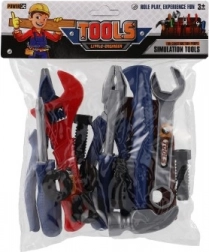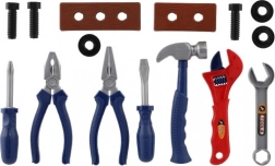 De set bevat typische gereedschappen zoals een hamer, schroevendraaier, tang en sleutel, evenals moeren en bouten om het schroeven te oefenen. Dankzij het praktische zakje is opruimen en meenemen een fluitje van een cent – ook geweldig als cadeau.