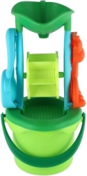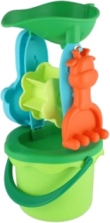 De praktische set combineert een emmer met zeef, schep en harkje – ideale uitrusting voor het bouwen van kastelen en het zeven van zand.