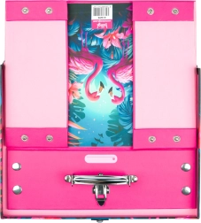 Stijlvolle opvouwbare koffer met een opvallend motief van flamingo’s en tropische flora voor schoolkinderen. Afgewerkt met beslag voor extra duurzaamheid en een elegante uitstraling.