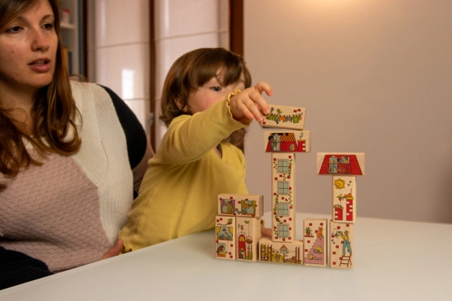 Met de bouwset Klein huis van Milaniwood kunnen kinderen talloze verschillende huisjes vol details maken. Elk huisje kan uniek zijn, met figuren die het alledaagse leven beleven te midden van leuke kleine diertjes, bloemen en andere objecten in aangename kleuren. Oudere kinderen kunnen hun creativiteit verder ontwikkelen door hun eigen ideeën op de achterkant van de blokken te tekenen.