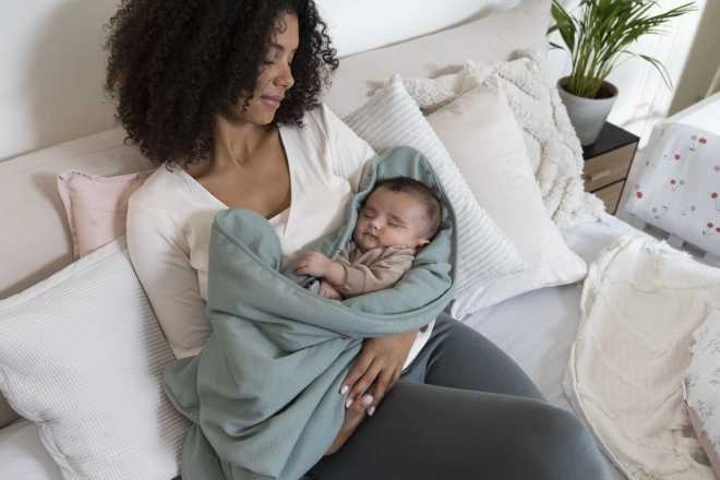 Zeer zachte deken, ideaal om je baby thuis of tijdens wandelingen buiten in te wikkelen.
