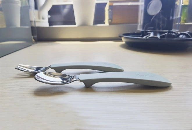 Zowel de lepel als de vork hebben een hygiënische 'contactloze' houder die direct contact met oppervlakken voorkomt. Het handvat van het bestek is ergonomisch, waardoor het gemakkelijk vast te houden is, zelfs voor kinderen die nog maar net leren zelfstandig te eten. Dankzij het siliconen handvat glijdt de lepel niet uit kleine kinderhandjes.
