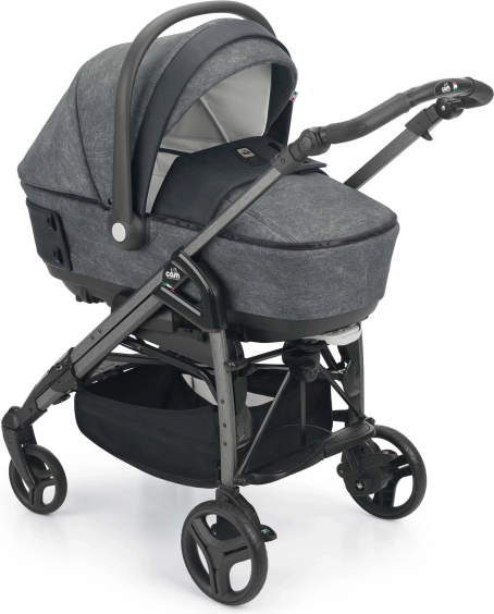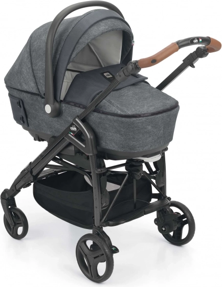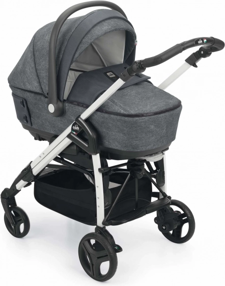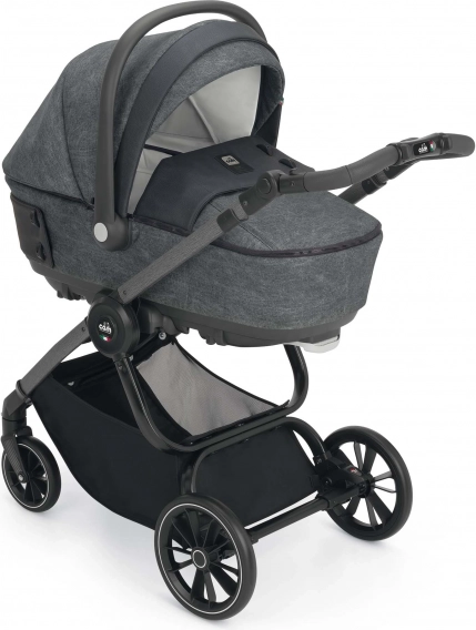 Ruime, diepe wiegbak met een modern uiterlijk en accessoires in de vorm van interessante knopen. De voetenzak van de wiegbak kan eenvoudig met ritsen worden losgemaakt. Dankzij de ventilatie in de kap is hij ook ideaal voor de zomermaanden. Door de steunen aan de onderkant van de bak uit te klappen, kan de wiegbak ook als schommelwieg worden gebruikt. Met de vergrendeling aan de onderkant van de bak kan de hoofdpositie van het kind in hoogte worden versteld. De bak heeft een eenvoudig afneemsysteem van het onderstel met slechts één vergrendeling, voor nog meer veiligheid bij het hanteren van de bak en het kind.